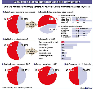 Buenos Aires, 23 de octubre (Télam).- El 41 por ciento de las empresas dispuso alguna medida de compensación salarial durante este año para paliar las consecuencias de la devaluación, aunque sólo la mitad de esas compañías entiende que los beneficios pueden ser considerados como un incremento de sueldo, según se desprende de una encuesta privada sobre tendencias salariales difundida este miércoles.