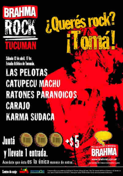 Las entradas estarán venta a $12.- en Rock & Pop Net Tucumán, y la promoción válida hasta el 7 de abril, de 3 tapitas de Brama más $5.- (en efectivo), se conseguirá en Flecha Bus y en los Refishop de todas las Refinor del NOA.