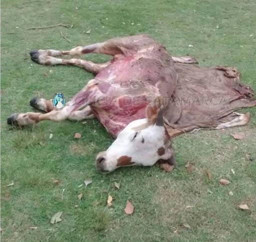Tras realizar una minuciosa investigación, el personal policial interviniente materializó un registro domiciliario en una vivienda ubicada en el barrio San Martín de la localidad de Chumbicha, Dpto. Capayán, propiedad de la familia Salas, donde secuestró un animal vacuno que estaba siendo faenado, de aproximadamente unos 100 kg.
